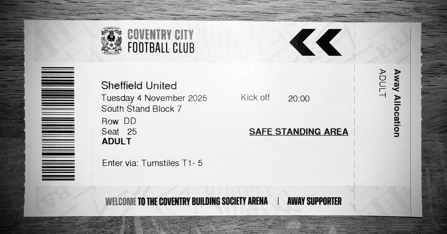Cue an unexpected goalkeeping substitution for the Blades for the start of the second half, losing Cooper to a back injury. Replaced by the seldom-seen Welsh international Adam Davies, there was suddenly a bit of anxiety in the away end. Anxiety realised, as United’s first-half lead didn’t last long. Coventry had come out flying, and a simple knockdown, coupled with two Blades defenders getting in each other’s way, left Tatushiro Sakamoto to slot it home past substitute ‘keeper Davies. 1–1. Tails up.
